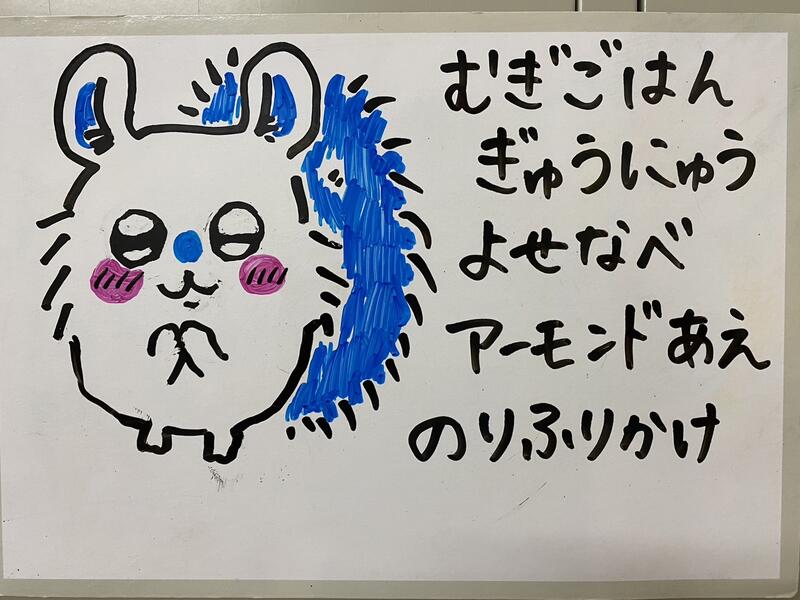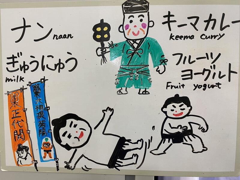本日は、本町で大相撲の巡業が行われました。このことにちなんで、献立ボードも大相撲バージョンで描かれていました。とてもよく描かれていて、驚きました。この献立ボードも、本校の自慢の一つです。キーマカレーがナンとよくあって、とても美味しくいただきました。フルーツヨーグルトを楽しみにしていた子もいたようです。