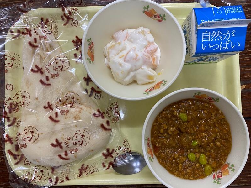 「ビーンズチリドック」は、自分でパンに挟んで食べるように用意されていました。子どもたちは、ビーンズチリソースを思い思いに挟みながら食べていました。野菜スープは、とても優しい味で、本日のような寒い日にはピッタリの献立でした。「カリポリアーモンド」は、いりこからたくさんカルシウムを摂れたことでしょう。