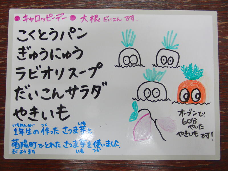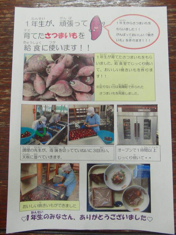 本日の献立には「やきいも」がありましたが、このサツマイモは、1年生が生活科で収穫したものが使われていました。調理された様子についても紹介します。とても甘くて美味しかったです。1年生の皆さん、ありがとうございました。