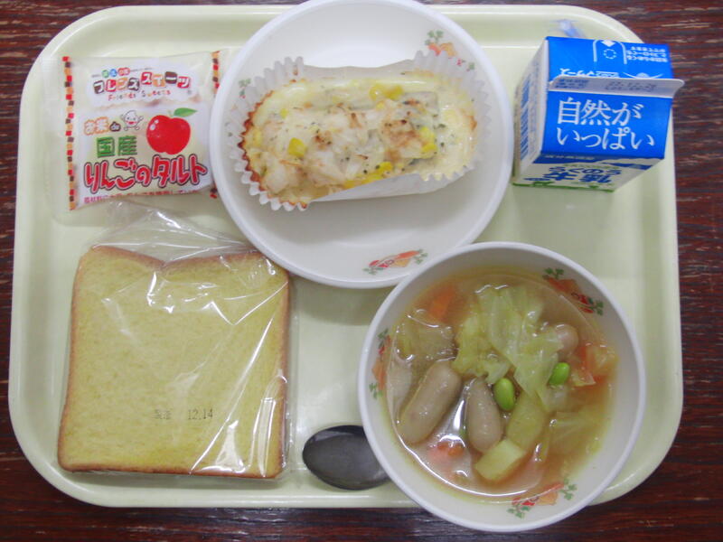 「カレーポトフ」は、カレー味も相まって、とても体が温まりました。「魚のビーンズ焼き」は、とても丁寧に料理されていて、みんな美味しそうに食べている表情が印象的でした。デザートで「リンゴタルト」がついていましたので、子どもたちは喜んでいました。
