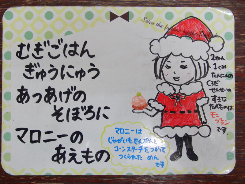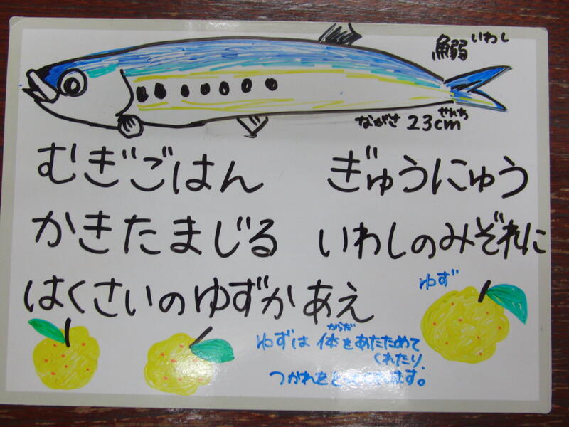 本日は雪の舞う寒い一日でしたので、汁物がとても有り難く感じました。食べている子どもたちにも、温かな笑顔が見られました。本日の献立シートに描かれた鰯の絵は、本当に力作です。給食当番の子どもたちも、この鰯の絵をしっかりと見ていました。