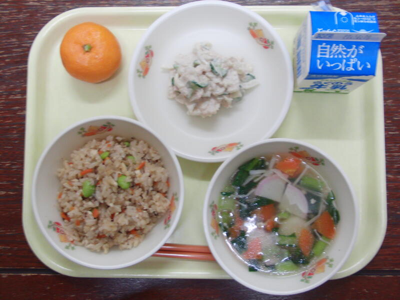 本日は、「ふるさとくまさんデー」で、宇城地区で有名な料理が出されました。「びりんめし」という混ぜご飯を楽しみにしていました。精進料理ということで、肉や魚の代わりに豆腐が入っていて、風味豊かな郷土料理でした。白玉を大事そうに食べている子、れんこんの食感を楽しんでいる子、ミカンを一房ずつ食べている子など、それぞれ楽しみながら食べていました。