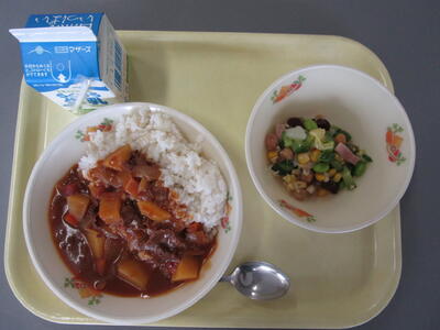今日の給食は、ハヤシライス、牛乳、ビーンズサラダでした。子ども達みんな大喜び。ハヤシライス、沢山もりもりと食べていました。ビーンズサラダには、いろいろな豆が入っていて、おいしくいただきました。給食の先生方が心を込めて作ってくださった給食は、とてもおいしいです。
