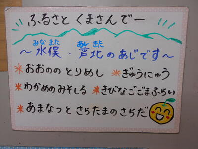 今日は、月に1度の「ふるさと・くまさんデー」。5月は「水俣・芦北地区」特産の食材がたくさん使われた献立で、「大野の鶏めし・きびなごフライ・サラ玉と甘夏のサラダ・わかめの味噌汁・牛乳」です。どれもとっても美味しく、水俣・芦北の味を味わわせていただきました。今日もごちそうさまでした。