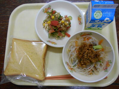 今日の献立は、「米粉入りにんじんパン・肉味噌ビーフン・トマトとじゃこのサラダ・牛乳」です。ビーフンは、お米からできた「麺(めん)」です。東南アジアで最も多く食べられている麺の一つだそうです。あっさりした麺に肉味噌がからんで、満腹感アップでした。6月もおいしい給食を、ありがとうございました