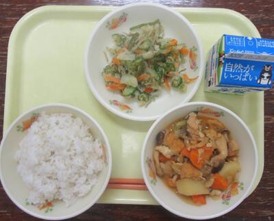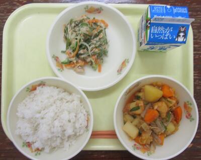 今日の献立は、「麦ご飯、牛乳、じゃが豚キムチ、くきわかめのサラダ」です。じゃが豚キムチ、ご飯のおかずにピッタリ、ご飯がすすむ美味しさです。くきわかめのサラダ、くきわかめのシャキシャキの食感が食欲をそそります。今日もおいしい給食ありがとうございました。