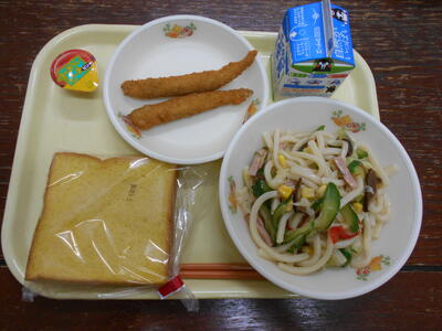 今日の献立は、「米粉入りにんじんパン・サラダうどん・ししゃもフライ・ミニピーチゼリー・牛乳」です。まだまだ暑い日が続いています。さっぱり・つるっと喉をとおる「サラダうどん」、とっても美味しかったです! 給食室では、給食調理の先生方が額に汗をにじませながら、心をこめて給食を作っていらっしゃいました。今日も美味しい給食をありがとうございます!