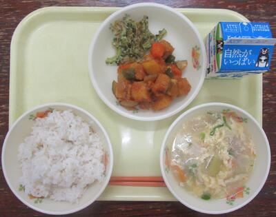 今日の献立は、「麦ご飯、ゴーヤチップス、冬瓜とたまごのスープ、魚と夏野菜の甘酢あえ、牛乳」です。冬瓜のとろっとした感じとたまごのふんわり感がうれしい美味しさでした。甘酢あえはご飯が何杯も食べられるほどの美味しさ、ゴーヤチップスは、いつまでも食べ続けられるほど美味しい。今日もおいしい給食ありがとうございました。本日は、来校された方々にも給食を食べていただきました。皆様、「おいしい給食ですね。」と感想を述べられてました。