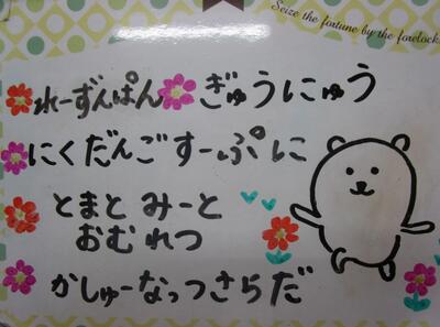 今日の献立は、「麦ご飯、牛乳、タットリタン、ごまじゃこサラダ」です。タットリタンは、韓国の家庭料理と聞きました。肉じゃがみたいで、ご飯とよく合っていて、とても美味しくいただきました。ごまじゃこサラダも美味しくいただきました。給食で、いつもいろいろなサラダを食べることが出来て、ありがたいです。今日もおいしい給食ありがとうございました。