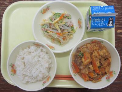 今日の献立は、「麦ご飯、牛乳、ジャージャン豆腐、春雨の酢の物」です。ジャージャン豆腐は家常豆腐とも書きます。中国の家庭料理です。豆腐と一緒に肉や野菜が煮込んであって、とても美味しいです。春雨の酢の物は、さっぱりしていて美味しくいただきました。まだまだ、暑い日が続きますが、元気に過ごしましょう。今日もおいしい給食ありがとうございました。