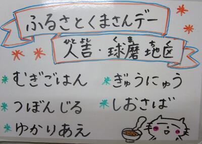 今日は、「ふるさとくまさんデー(人吉・球磨地区)」です。今日の献立は、「麦ご飯、牛乳、つぼんじる、しおさば、ゆかりあえ」です。つぼん汁とは、料理を盛る器の中で、壺という一番深い椀に入れて出されていたので、つぼの汁から「つぼん汁」とよばれるようになったそうです。鶏肉、豆腐、野菜、いもなど沢山の材料を使います。お祭りや人が集まる時などの特別な日に欠かせない郷土料理を美味しくいただきました。しおさばやゆかりあえもご飯と合っていて美味しくいただきました。今日もおいしい給食ありがとうございました。