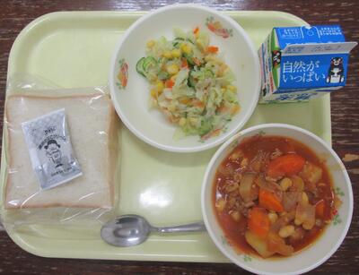 今日の献立は、「食パン、牛乳、ポークビーンズ、キャベツとコーンのサラダ、黒豆きな粉クリーム」です。ポークビーンズは、豚肉と豆が柔らかくて美味しくいただきました。子ども達も大喜びでした。サラダは、食べ応えあり、元気いっぱいになります。今日もおいしい給食ありがとうございました。