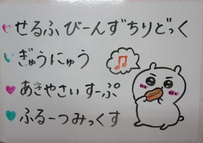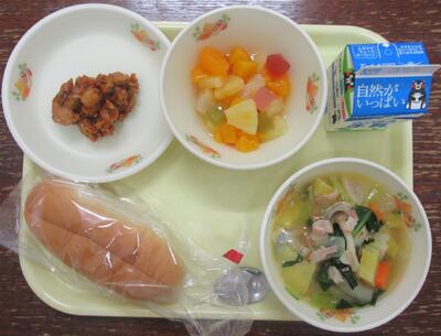 今日の献立は、「セルフビーンズチリドック、牛乳、秋野菜スープ、フルーツミックス」です。セルフビーンズチリドックは、ビーンズチリドックの味付けよく、パンともよくあっていておいしくいただきました。秋野菜のスープは、さつまいもや小松菜、しめじ等々が沢山入っていてとてもおいしかったです。フルーツミックスは、子ども達、大喜びでした。今週も美味しい給食、ありがとうございました。