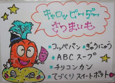 今日は、キャロッピーデー「さつまいも」です。献立は、「コッペパン、ABCスープ、チリコンカン、手作りスイートポテト、牛乳」です。ABCスープは、アルファベットの形等のパスタを見つけながら食べることが楽しいスープで、お肉の味もよく、美味しくいただきました。チリコンカンは、パンに挟んでも、そのままでも美味しいチリコンカン、おまめが柔らかく沢山いただきました。「手作りスイートポテト」給食の先生方の愛情いっぱいの手作りです。柔らかくて、焦げ目がまたすばらしく、バターも感じながら、いただきました。牛乳と一緒にいただくのもまた美味しい。今日もおいしい給食ありがとうございました。