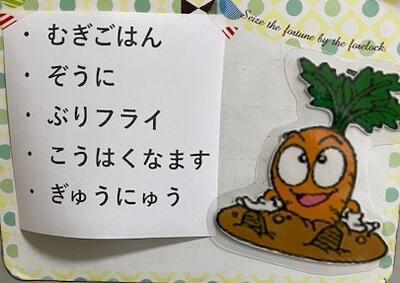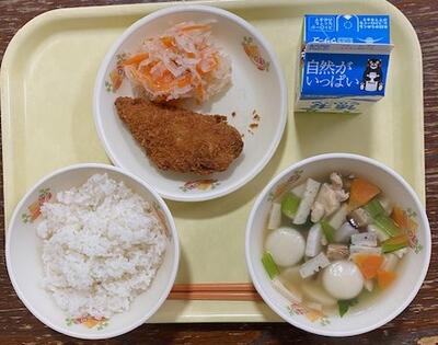今日の献立は、「麦ご飯、雑煮、ぶりフライ、紅白なます、牛乳」です。お雑煮は、体が温まり、心もホットします。具材が食べやすく、おもちも美味しいです。ぶりフライは、サクッとしていて美味しいです。紅白なますも、甘酸っぱくて美味しいです。お正月を感じる、給食をいただきました。今日もおいしい給食ありがとうございました。