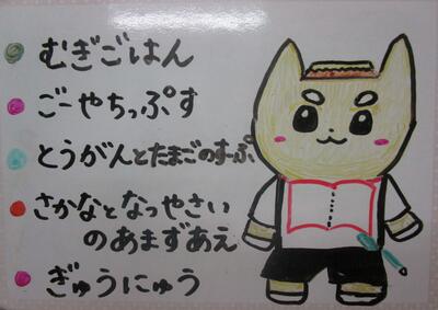 今日の献立は、「麦ご飯、ゴーヤチップス、冬瓜とたまごのスープ、魚と夏野菜の甘酢あえ、牛乳」です。冬瓜のとろっとした感じとたまごのふんわり感がうれしい美味しさでした。甘酢あえはご飯が何杯も食べられるほどの美味しさ、ゴーヤチップスは、いつまでも食べ続けられるほど美味しい。今日もおいしい給食ありがとうございました。本日は、来校された方々にも給食を食べていただきました。皆様、「おいしい給食ですね。」と感想を述べられてました。