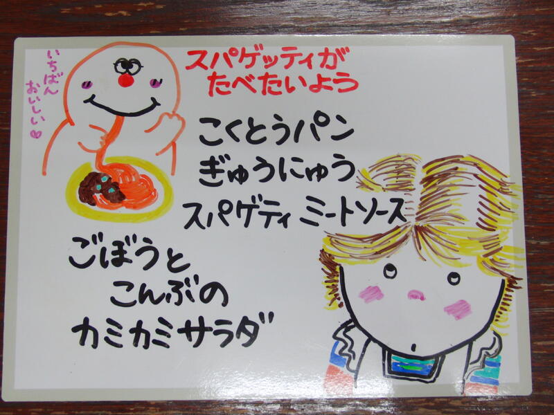 本日の「絵本に出てくる料理」の献立は、「スパゲティがたべたいよう」から考えられました。お化けと主人公のコミカルなやり取りが書かれた絵本です。子どもたちにとっても、スパゲッティは人気の献立でしょう。「ごぼうとこんぶのカミカミサラダ」も、食感がほどよく、大変美味しかったです。