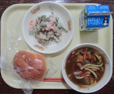 今日の献立は、「ひのくにパン、カレーうどん、れんこんの梅マヨサラダ、牛乳」です。カレーうどんは、とろみがあるカレースープがうどんによく絡んでいて、美味しいです。麺の他の具材も味がしみています。れんこんの梅マヨサラダは、れんこんのシャキシャキ感、茎わかめ、きゅうりの食感、食べながら食感も楽しめる美味しいサラダでした。今月もおいしい給食ありがとうございました。