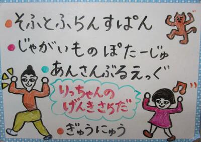 今日の献立は、「ソフトフランスパン、じゃがいものポタージュ、アンサンブルエッグ、りっちゃんのげんきサラダ、牛乳」です。じゃがいものポタージュは、ホクホクしたじゃがいもと他の具材が食べやすい柔らかさで、美味しくいただきました。りっちゃんのげんきサラダは1年生の国語の教科書に登場するサラダです。今日は、りっちゃんのげんきサラダが実際の給食に登場しました。今日もおいしい給食ありがとうございました。