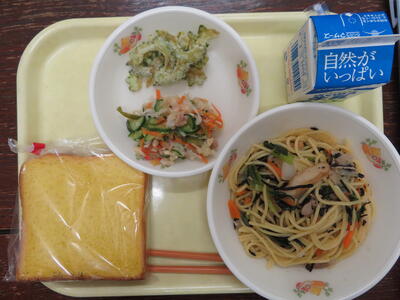 今日の献立は、「わかめご飯、こそでだご汁、きびなごサクサクあげ、れんこんサラダ、牛乳」です。こそでだご汁は、だごが柔らかくて、美味しいです。鶏肉、しいたけ、ごぼう等、味よく、あたたまりました。きびなごサクサクあげは、サクサクッとした食感ときびなごの美味しさが口の中に広がります。れんこんサラダは、れんこんの食感がよく、他の野菜ともよく馴染んでいて食べ応えありのサラダです。今日もおいしい給食ありがとうございました。