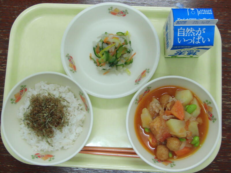 本日のテーマは、「酸味」でした。酸味は、酸っぱいと感じる味です。美味しく食べられる酸っぱい食べ物には、食欲を出したり、疲れをとる働きがあるそうです。また、味付けに酸味を使うと、塩分の取り過ぎを防ぐことが出来ると聞きました。本日の献立では、「カブのゆずか和え」がありましたが、ほんのりとゆずの香りがして、子どもたちも美味しく食べていました。「トマト肉じゃが」は、おかわりをする子がたくさんいました。「おちゃふりかけ」は、ご飯が進みました。