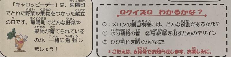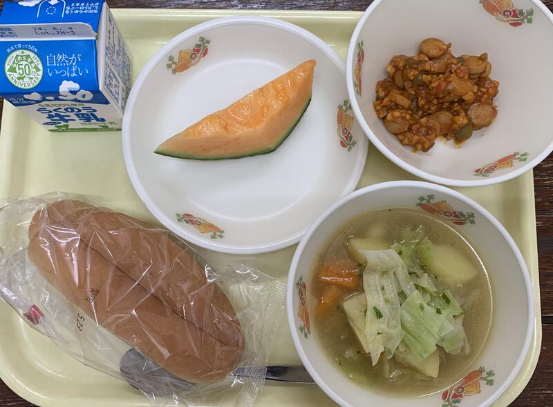今日の献立は、「ビーンズチリドック・やさいスープ・メロン・牛乳」です。そして、今日は「キャロッピーデー」。菊陽町で作られている食材を使った献立の日です。5月は、メロン。オレンジ色の果肉で、とーっても甘いメロンでした。今週も美味しい給食、ありがとうございました!