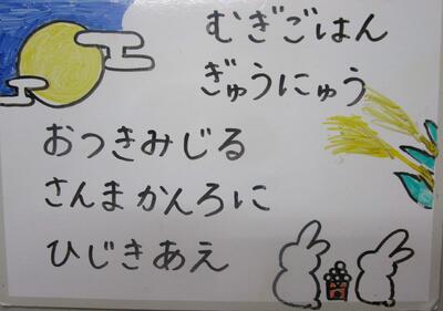 今日の献立は、「麦ご飯、牛乳、お月見じる、さんま甘露煮、ひじきあえ」です。まだまだ暑い日が続いていますが、今日は十五夜「中秋の名月」ですね。今年は満月は明日ですね。時間があれば、月を見てみましょう。給食では、お月見じるが出ました。白玉や里芋、沢山の具材が入っていておいしくいただきました。今日もおいしい給食ありがとうございました。