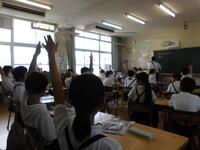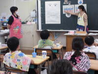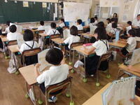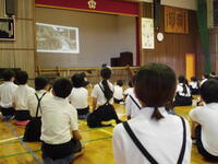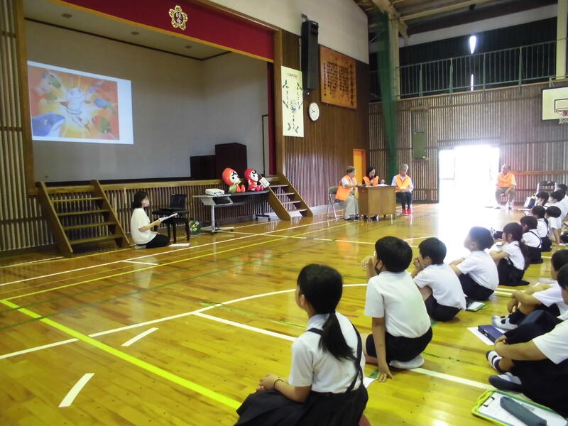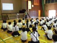 岱明町ホタルを育てる会の方に来ていただき、ホタルについて体のしくみや生態を模型や紙芝居を使ってわかりやすく教えていただきました。きれいな水が絶対に必要ですね。