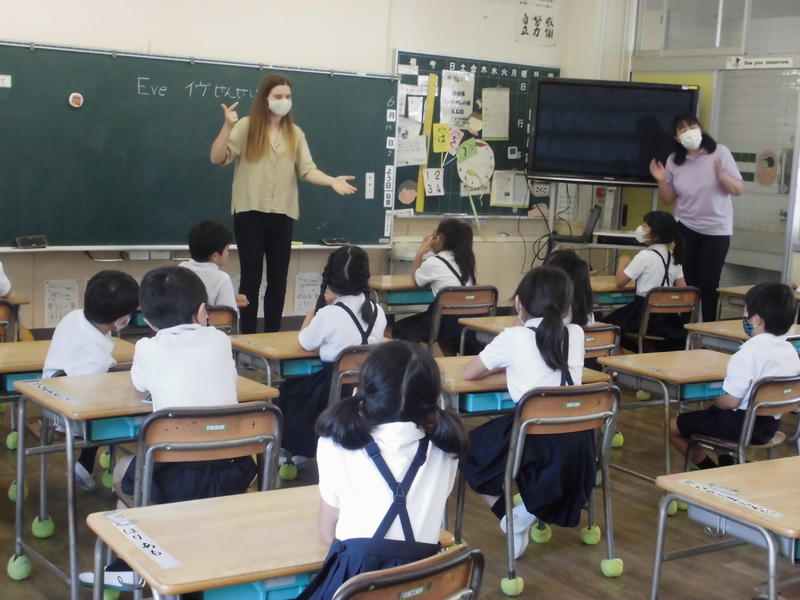 玉名市のALT、イヴ先生による「えいごであそぼう」の授業がありました。