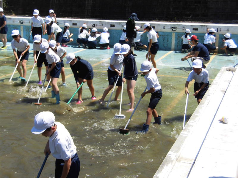 水泳及び水遊びの学習に向けて、プール掃除をしました。汚れがひどくて、磨くのも大変でした。