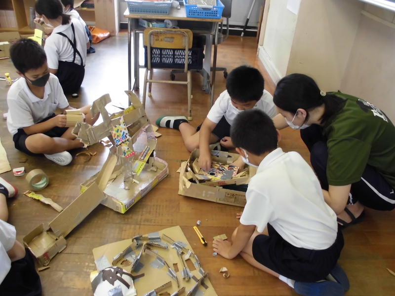 4年1組では、段ボールを使った図工の学習がありました。子供たちは、段ボールを切ったりちぎったりして、