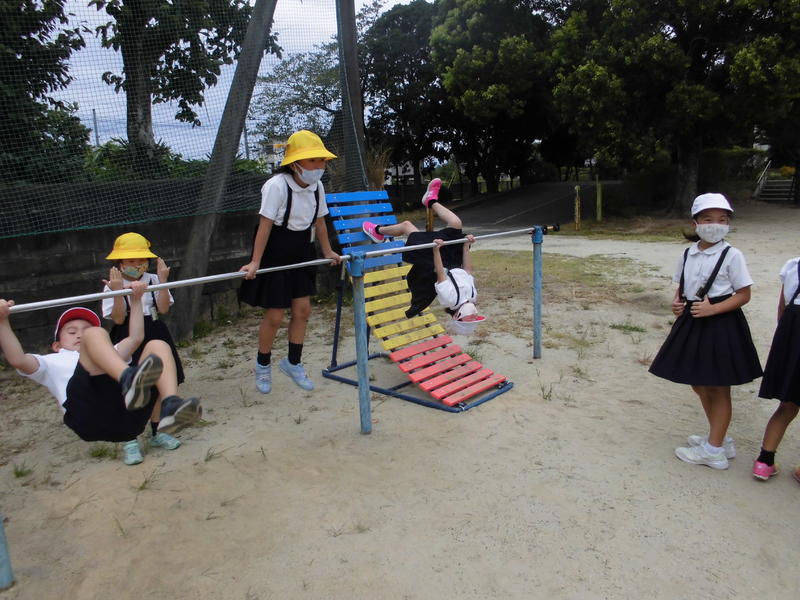 2年生は、鉄棒の学習をしています。布団干しや逆上がりなど、いろいろな技に挑戦しています。