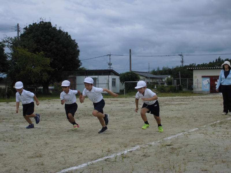 日中の暑さを避けて、徒競走の練習をしました。担任の先生の合図に合わせて「よおい ドン!」と