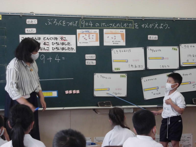 今日は、1年生の研究授業がありました。繰り上がりのあるたしざんの学習です。