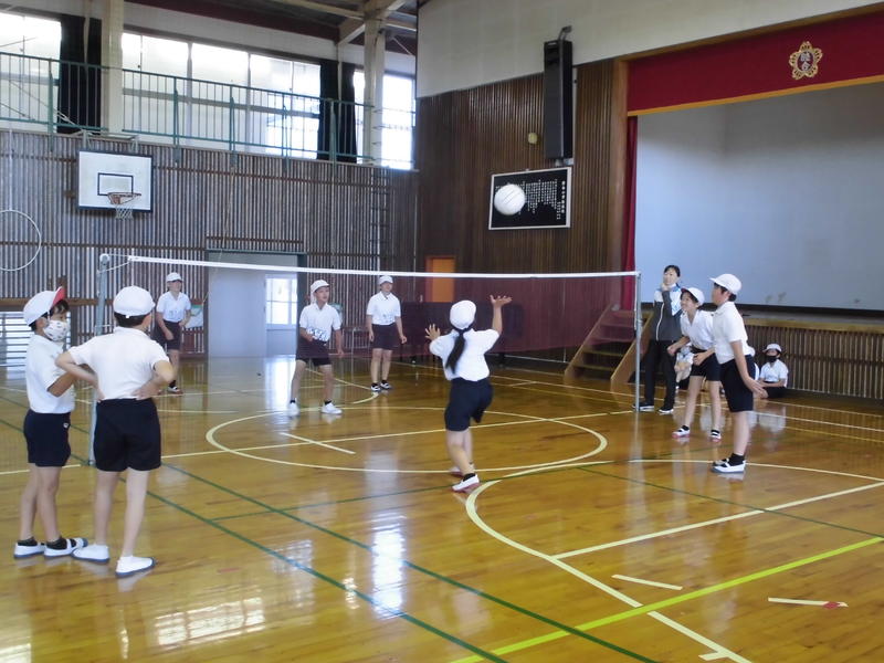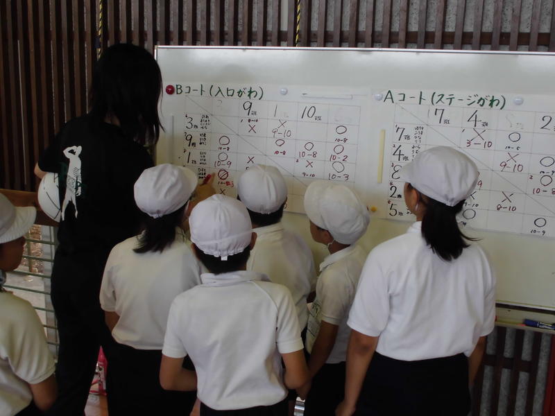 体育館では、4年生合同で、「キャッチバレーボール」の試合をしていました。
