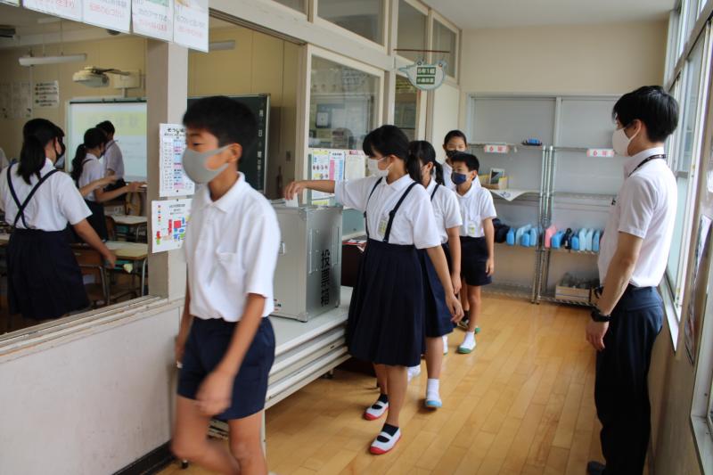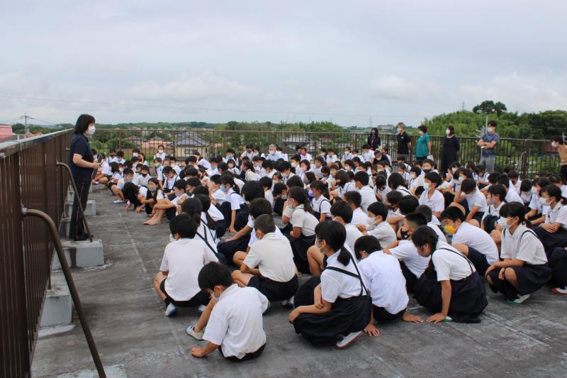今日は、地震・津波に対応する避難訓練を行いました。初めに訓練の目的と流れを説明し、気象庁制作の「津波からにげる」の動画を視聴し、訓練に備えました。運動場の地面が湿っていたので、第一次避難(揺れに対する対応)の集合場所を体育館に変更し、予定通り第二次避難(津波対応)まで行うことができました。屋上に全員が集合するのは久しぶりということで、みんな少し緊張していたようです。最後まで真剣に取り組むことができました。