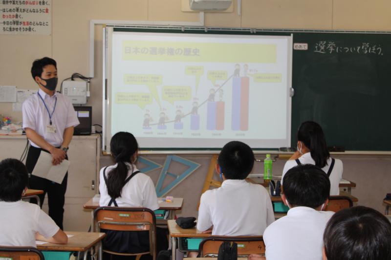 社会科の学習で、選挙に関する学習をしました。熊本県選挙管理委員会の方に選挙の意義や方法などについて、わかりやすく説明していただきました。実際に投票体験も行い、有権者になりきって選挙箱に投票用紙を入れていました。結果発表も盛り上がっていました。今日は大変貴重な学習ができ、関係機関の方々に感謝いたします。キラキラ