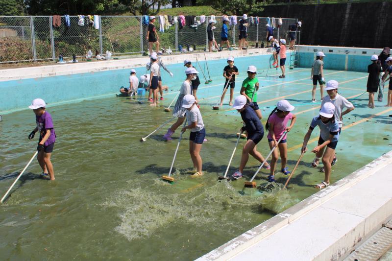 今日は、各学年に分かれてプール掃除を行いました。デッキブラシやたわし、バケツを手に、プールサイドやプールの底や壁、目洗い場など、隅々までゴシゴシ磨いてくれました。これからプールでの学習を、安全に楽しく進めていきたいです。