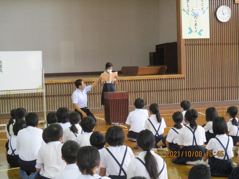 10月8日(金) 前期終業式 投稿日時 : 2021/10/08 学校サイト管理者 今日は、前期の終業式でした。1~3年の低学年と4~6年の高学年に分けて、体育館で行いました。久しぶりに集会形式で行いましたが、みんな姿勢も良く、しっかり話を聞いてくれました。代表の子供たちが前期にがんばったことや後期に取り組みたいことなどを発表してくれました。校長講話では、『小さいルール』を守る大切さを話しました。また、後期も元気に登校して欲しいです。 Tweet {{options.likeCount}} {{options.likeCount}} 0 コメント