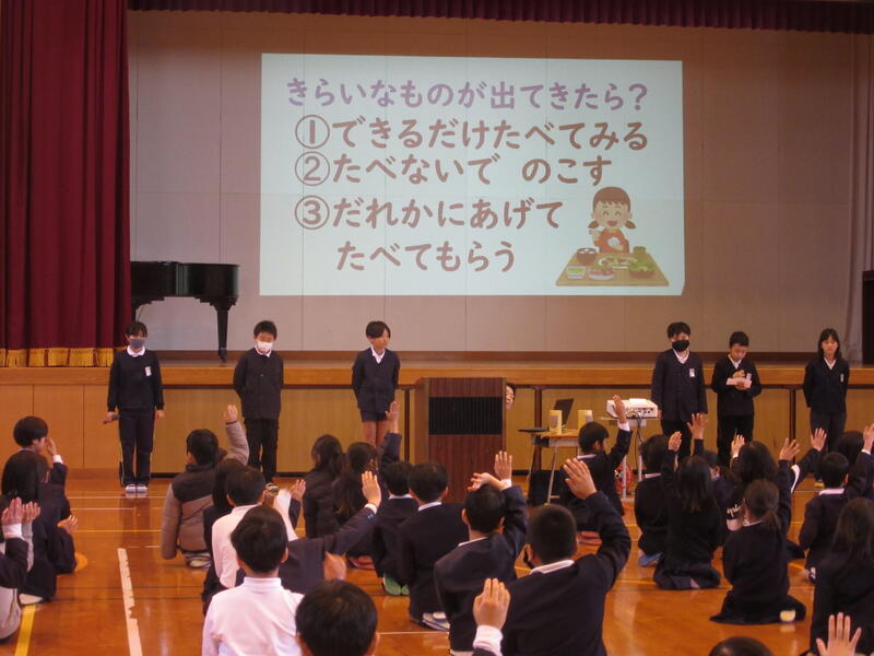 給食集会は、1月24日~1月30日までが「全国学校給食週間」と定められていることを受けて開催したものです。学校給食は明治22年に始まり、戦争の影響で中断された後、昭和22年1月に再開されました。安心・安全な食材を提供してくださっている生産者の方々、給食を作ってくださっている給食センターの方々など、関係者の皆様方に感謝しながら給食をいただきたいと思います。