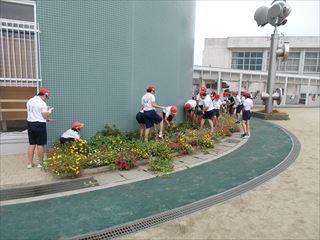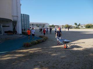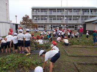 6年生は外で刈った草を集めたり花壇の草取りをしたりしていました。