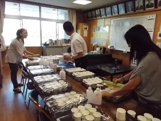 今回は、津波による災害を想定して、多目的ホールで救給カレーを配布し、教室で食べることにしました。