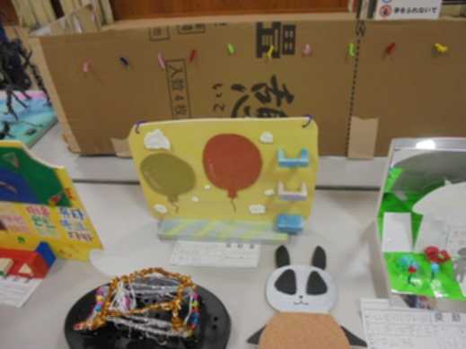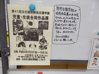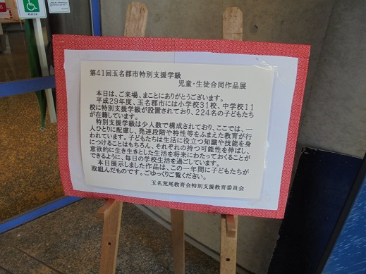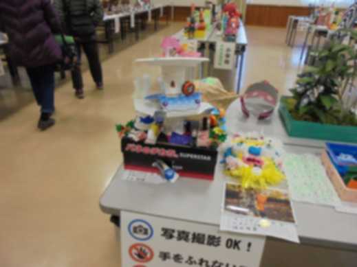 2月18日 投稿日時 : 2018/02/19 学校サイト管理者 2月18日(日)です。今日は学校は休みですが、玉名荒尾立体造形展と特別支援学級の合同作品展の様子を紹介します。玉名市民会館では玉名荒尾立体造形展が開催されています。長洲小学校の子どもたちの作品も展示されていました。他の学校の子どもたちが作った力作もあるので、見ていても楽しいですし、鑑賞し良いところを学ぶ事で自分の作品作りに生かすこともできます。こちらは特別支援学級の合同作品展の様子です。合同作品展では、工作だけでなく絵画や習字などの作品も多数展示してあります。こちらにも長洲小学校の子どもたちの作品が多数展示してあります。書写の作品です。工作です。会場の様子です。写真は個人情報保護のため加工してあります。実物を見るともっと作品の良さが伝わると思いますので、お時間があればお子さんと一緒に見に行っていただければと思います。