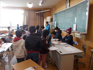 12月4日 投稿日時 : 2017/12/05 学校サイト管理者 12月4日(月)です。今日は朝から6年生の卒業写真撮影を行いました。卒業アルバムや職員室前の写真に使われます。6年生も楽しみにしていたようで、終始笑顔でした。写真撮影を待っている6年生です。ひな壇をつくり、乗っていきます。結構高さがありました。卒業アルバムができるのが楽しみですね。写真撮影後は、一緒に写って下さった先生方にお礼を言ってくれました。さすが6年生です。さて、2校時には算数少人数の授業研究会を行いました。学年は5年生です。4年生以上は、どんどんコース、ゆっくりコースなどを選び、自分に合ったペースで算数の学習を進めています。今日はどんどんコースの授業でした。姿勢正しく授業に取り組んでいます。手の上げ方もさすがですね。ノートも工夫されており、今までの学習が分かるようなノートでした。自分の考えを前に出て説明しています。説明の仕方も上手でした。まとめたあとに適用問題にも取り組みました。振り返りを言っています。毎日の学習で行っているので、振り返りもきちんと言ったり聞いたりできていました。本校の校内研究は国語科が中心ですが、算数や道徳、特別支援教育の授業研究会も行っています。指導案を書き、研究授業を行うことは、とても労力を使いますが、その分たくさんのことを学ぶことができます。学んだことを子どもたちに返していくことが大切だと思っています。