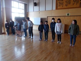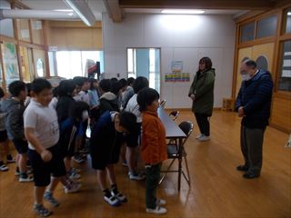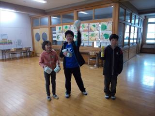 2月7日 投稿日時 : 2018/02/08 学校サイト管理者 2月7日(水)です。今朝も運動場で子どもたちが元気に遊んでいました。凍えるような寒さの中、毎日遊ぶ子どもたちに感心します。3年生がフットベースボールをしています。一輪車に楽しそうに乗っています。空には下弦前の月がうっすらと見えていました。業間には児童集会を行いました。内容は校長先生の話と、給食委員会の発表です。校長先生はインフルエンザにかからないように注意してほしいということと、そのために手洗いが大事なことを話されました。保健委員会の発表では、給食準備や後片付けに関するお願いや、給食に関するクイズ、野菜を食べ好き嫌いをなくすことが大切だということを伝える寸劇など、工夫された盛り沢山な内容でした。給食に関するクイズです。結構難しいクイズでした。給食の味方、野菜レンジャー?の登場です。準備・後片付けに関する寸劇です。名演技でした。給食委員会の発表に対するお返しも上手に言うことができました。6年生前の看板作りスペースです。文字が書かれているので、この文字が看板になるのでしょうか?廊下はとても寒かったですが、日が当たっているところは暖かく感じました。子どもたちは暖かいところを見つけるのが得意です。進んでトイレのスリッパを並べている子どもがいました。誰も見ていない場所でしたが、きちんと並べてくれていることに感心しました。今日の給食です。野菜は残さずに食べることができたでしょうか?お家で尋ねてみて下さい。昼休みの様子です。本当にたくさんの子どもたちが仲良く遊んでいます。