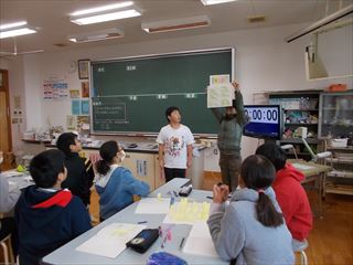 12月13日 投稿日時 : 2017/12/14 学校サイト管理者 12月13日(水)です。今日は朝から寒かったですが、気持ちのよい天気となりました。今日は学習発表会のリハーサルの第一日目です。各学年時間をずらしてながす未来館に行き、本番の動きや照明、音響などの確認を行いました。(すみません。写真はありませんが…。)いよいよ学習発表会まであと4日となりました。インフルエンザや胃腸炎なども流行しはじめているようです。学習発表会で力を出し切るためにも、隊長をしっかり整えて、本番に臨んでほしいと思います。さて、4年生の理科の授業では水のすがたと温度の学習をしています。現在、水を冷やした時の水の温度と様子の変化を調べています。水を冷やしていくと、零度付近で凍りはじめ、完全に凍ってから、さらに温度が下がっていきます。今日は実験結果をグラフと付箋でまとめ、水を冷やすと水の温度や様子がどのようになるのか考えました。班で話し合いながら実の温度の変化とその時の水の様子を組み合わせてまとめていきます。みんなで考えると、自分が気づかなかったことに気づくことができます。グラフと付箋をまとめたものです。水の温度と様子の変化がよく分かります。新しい学習指導要領では、「主体的・対話的で深い学び」ができることが求められています。主体的に実験や観察を行い、結果などを話し合いながらまとめていくことで、子どもたち同士で深く学ぶことができます。すぐにできることではありませんが、毎日の学習で少しずつ積み上げていくことで子どもたちの力をつけていきます。