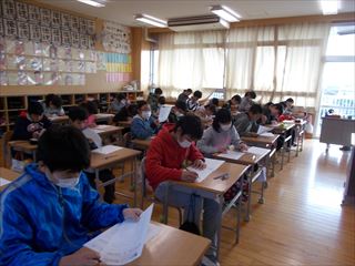 12月5日 投稿日時 : 2017/12/06 学校サイト管理者 12月5日(火)です。今日は2・3校時に3年生以上の学年がゆうチャレンジを行いました。ゆうチャレンジは熊本県独自の学力調査で、「ゆうチャレンジ」という名称には・熊本県独自の問題の意味の「熊」・友だちとともに高め合って欲しいという意味の「友」・「あなた」である一人一人の子どもたちにチャレンジしてほしいというyouという意味が込められているそうです。普段学校で行っている評価テストとは少し形式が違い、関心・意欲や思考力、表現力などを詳しく評価できる問題となっています。読んだり書いたりする部分が多いので、子どもたちも頭をひねりながら、しかし一生懸命取り組んでいました。3年生です。4年1組です。4年2組です。5年1組です。5年2組です。6年1組です。6年2組です。学力検査の目的は、自分がどこができていて、どこができていないかを把握することです。もうすぐ後期前半も終わり、来年はいよいよまとめの後期後半です。ゆうチャレンジの結果をいかして、さらに力をつけて欲しいと思います。
