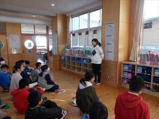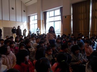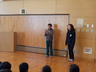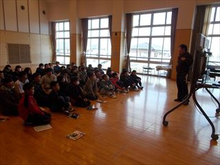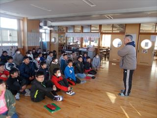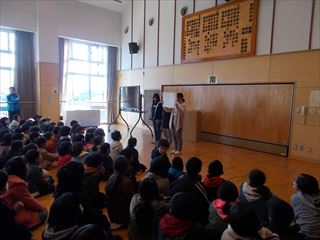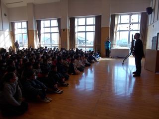 12月22日 投稿日時 : 2017/12/25 学校サイト管理者 12月22日(金)です。今日は後期前半の最後の日でした。天気も良く、日光が当たっている昼間は特に暖かく感じました。昼休みはたくさんの子どもたちが校庭で遊んでいました。冬休み前の最後の日なので、学究によってはお楽しみ会を行う所もあったようです。みんな楽しそうです。昼休み後、冬休み前集会を行いました。まず、表彰を行いました。人権ポスターの表彰です。ポスターとっても上手でした。児童文集「ゆめ」の表彰です。たくさんの子どもたちが入賞しました。次に校長先生より、「ながす」と「五つの心」、安全について、そして冬休みも6冊の本を読むというお話がありました。校長先生は冬休みは子どもたちに読書冊数で勝てるでしょうか?1月9日が楽しみです。その後、保健と生徒指導、安全担当より、保健と生徒指導・安全についての話をしました。楽しい冬休みにするためにも、決まりを守って生活して欲しいと思います。ご家庭でも御指導よろしくお願いします。写真は養護の先生のお話です。さて1年は早いもので、平成29年もあと少しになりました。学校の節目は年度末の3月ですが、年越しはやはり大きな節目となります。今年、長洲小学校や本校児童が無事過ごすことができたのは、保護者、地域、学校を支えて下さっている様々な方々のおかげです。この場をお借りしてお礼申し上げます。平成30年もよろしくお願いいたします。