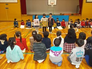 12月17日 投稿日時 : 2017/12/19 学校サイト管理者 12月17日(日)です。今日は学習発表会でした。特別な日なのですが、やっぱり朝からは校庭で元気に遊ぶ子どもたちの姿が…。さすが長洲小の子どもたちです。朝の会が終わっていよいよながす未来館へ移動です。ちょっと緊張してきたかな?初めの言葉です。はきはきと大きな声で立派に言うことができました。さすが6年生です。司会の子もとてもはきはきとしていました。初めに登校班あいさつ表彰を行いました。登校班と個人の代表2人が賞状を受け取りました。起立している子どもたちも、みんな挨拶をがんばっていて、本当に素晴らしいです。昨日紹介した司会進行の子どもたちも大活躍でした。次に全校合唱「ビリーブ」を歌いました。6年生がステージ上で歌ってくれました。ピアノ演奏もとても上手でした。トップバッターは5年生です。5年生は英語で桃太郎のお話を表現しました。それぞれの役がとても上手で、みんな楽しく学習したことが分かる内容でした。次は1年生です。1年生は「世界中の子どもたち」です。ALTのエリカ先生やNTのソフィー先生も登場してくれました。ご協力ありがとうございました。1年生も色々な特技を見せてくれ、見ごたえがありました。次は2年生による音楽劇「スーホの白い馬」です。まるで劇団のような迫真の演技でした。歌もとても上手でしたね。4年生は総合的な学習で学んだ金魚のことを発表してくれました。長洲町の金魚の歴史が良く分かりました。また歌や演奏も心に響きました。次はなかよし学級です。なかよし学級の子どもたちはこの発表の他にも交流学級の発表に参加していますので、練習が大変だったと思います。また、発表でなかよし学級のことが良く分かりましたね。次は3年生です。3年生は社会科見学旅行で学んだことを発表しました。リコーダーも今年からの学習ですが、とても上手でしたね。成長が良く分かります。発表の最後は6年生です。6年生の発表は平和学習や人権など、たくさんのことを考えさせてくれました。内容も笑いあり、まじめさありの、しまった内容でした。さすが6年生です。終わりの言葉です。これもさすが6年生。本当に立派に発表できました。最後まで発表をご覧いただきありがとうございました。ご家庭でも、お子さんのがんばりを認め。褒めていただければと思います。