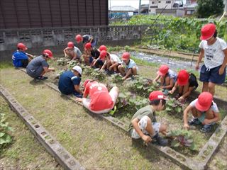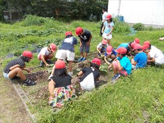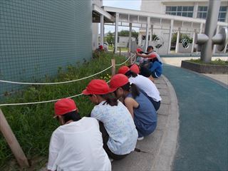 学級園で育てているサツマイモのお世話をしているのは3年生です。
